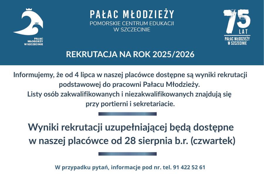 SzukajSzukaj KOMUNIKATY PLANY NA NOWY ROK SZKOLNY2025/2026 PRACOWNIE w roku szkolnym 2025/2026 NAUCZYCIELE NIEOBECNINauczyciele nieobecni, odwołane zajęcia NABÓR DO PRACOWNI rok szkolny 2025/2026 KONKURSYKonkursy, przeglądy, regulaminy oraz wyniki konkursów A TERAZ MYPrezentacje taneczne PÓŁKOLONIEletnie i zimowe LEŚNE SOBOTYWędrówki po Puszczy Wkrzańskiej i Puszczy Bukowej SOBOTA Z RPGGry fabularne PAŁACOWY UNIWERSYTET FANTASTYCZNYMini konwent WYCHOWANIE PRZEZ CZYTANIEProjekt realizowany od 2011 NAJNOWSZE WYDANIE MIESIĘCZNIKA „DIALOGI” NADCHODZĄCE WYDARZENIA gru 16 16 grudnia – 19 grudnia Czytanie III rozdziału Akademii Pana Kleksa oraz warsztaty Bożonarodzeniowe dla uczestników Pracowni Rozwoju Muzyczno-Ruchowego gru 16 16:30 – 20:30 Wigilia teatralna gru 20 09:00 – 14:00 1097 Leśna Sobota po Puszczy Bukowej sty 10 09:00 – 14:00 1098 Leśna Sobota po Puszczy Wkrzańskiej mar 29 Cały dzień XXII Prezentacje Taneczne „A teraz my” 2026 Zobacz kalendarz AKTUALNOŚCI Mikołajkowa 1096 Leśna Sobota |RELACJA 9 grudnia, 2025 o 14:41 Dary przekazane! 9 grudnia, 2025 o 12:34 Mikołajkowy weekend w Galerii Kaskada 9 grudnia, 2025 o 10:43 Pałacowe Mikołajki z Radiem Szczecin – relacja 9 grudnia, 2025 o 10:39 Wychowanie przez Czytanie | Tworzymy lalki 8 grudnia, 2025 o 10:31 Mikołajki już jutro! 5 grudnia, 2025 o 10:44 Dzień Misia 5 grudnia, 2025 o 9:59 PROJEKT EDUKACYJNY TURYSTYKA – REKREACJA – EKOLOGIA – moduł dwudziesty pierwszy – zakwalifikowane placówki 4 grudnia, 2025 o 9:31 Fantastyczne spotkanie z dreszczykiem 2 grudnia, 2025 o 15:07 1 2 3 … 599 ›